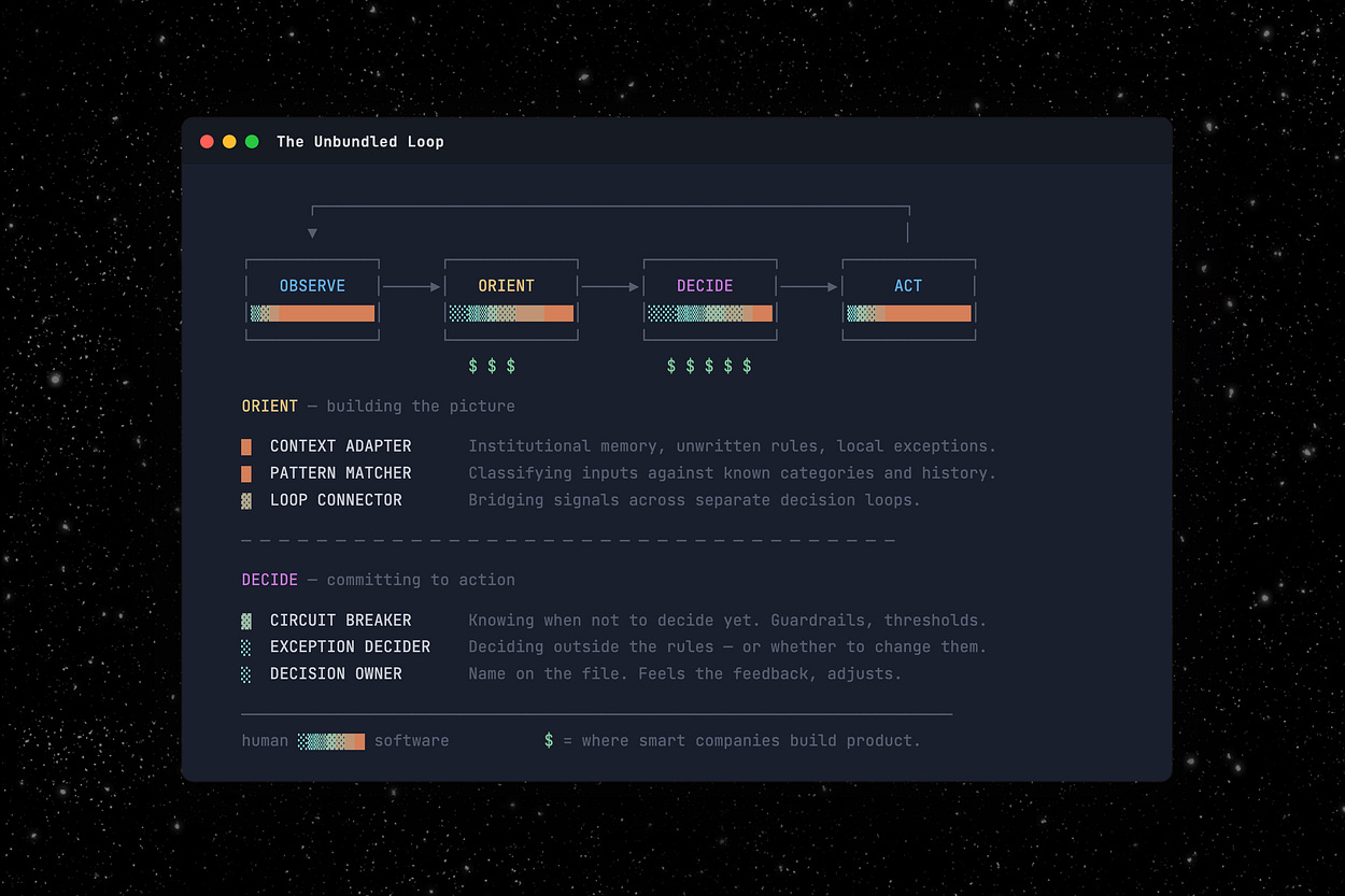 Every job is an OODA loop. AI doesn't replace the loop, but unbundles it into sub-functions. The most valuable ones are irreducibly human, and the smart…