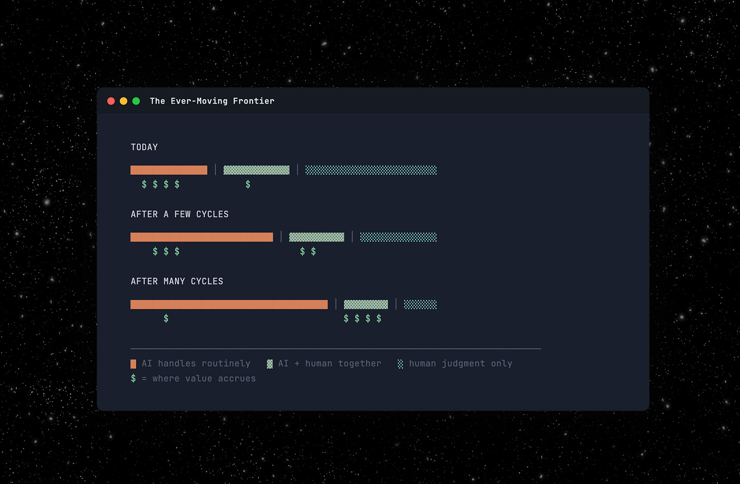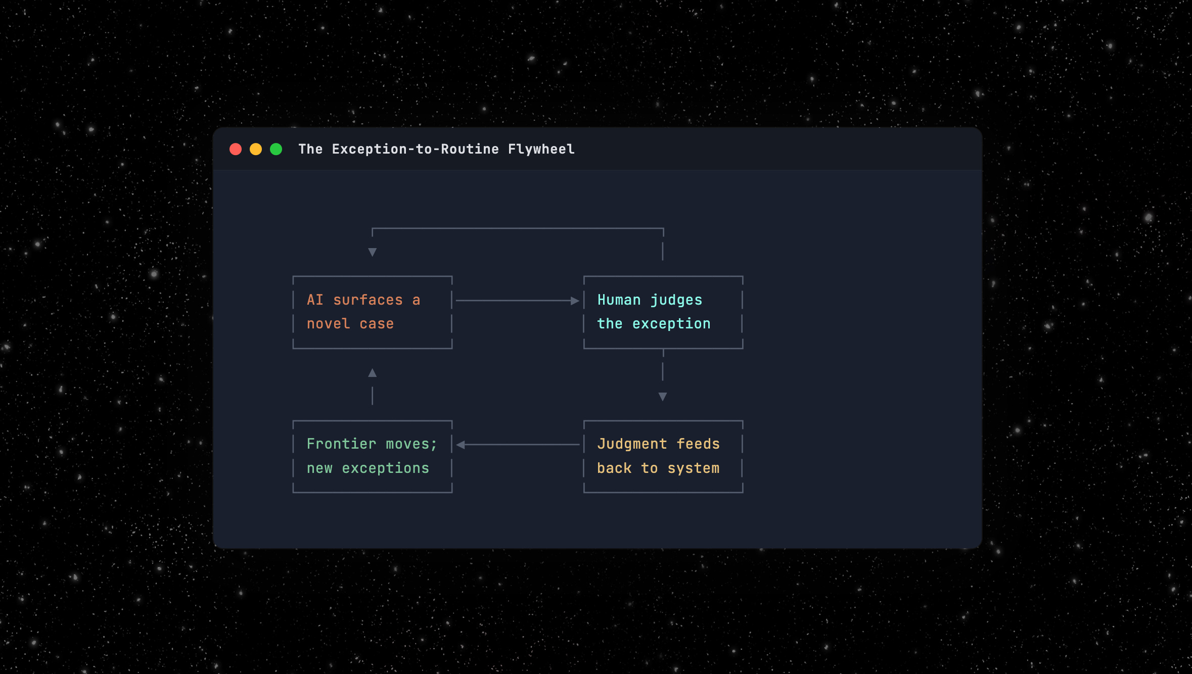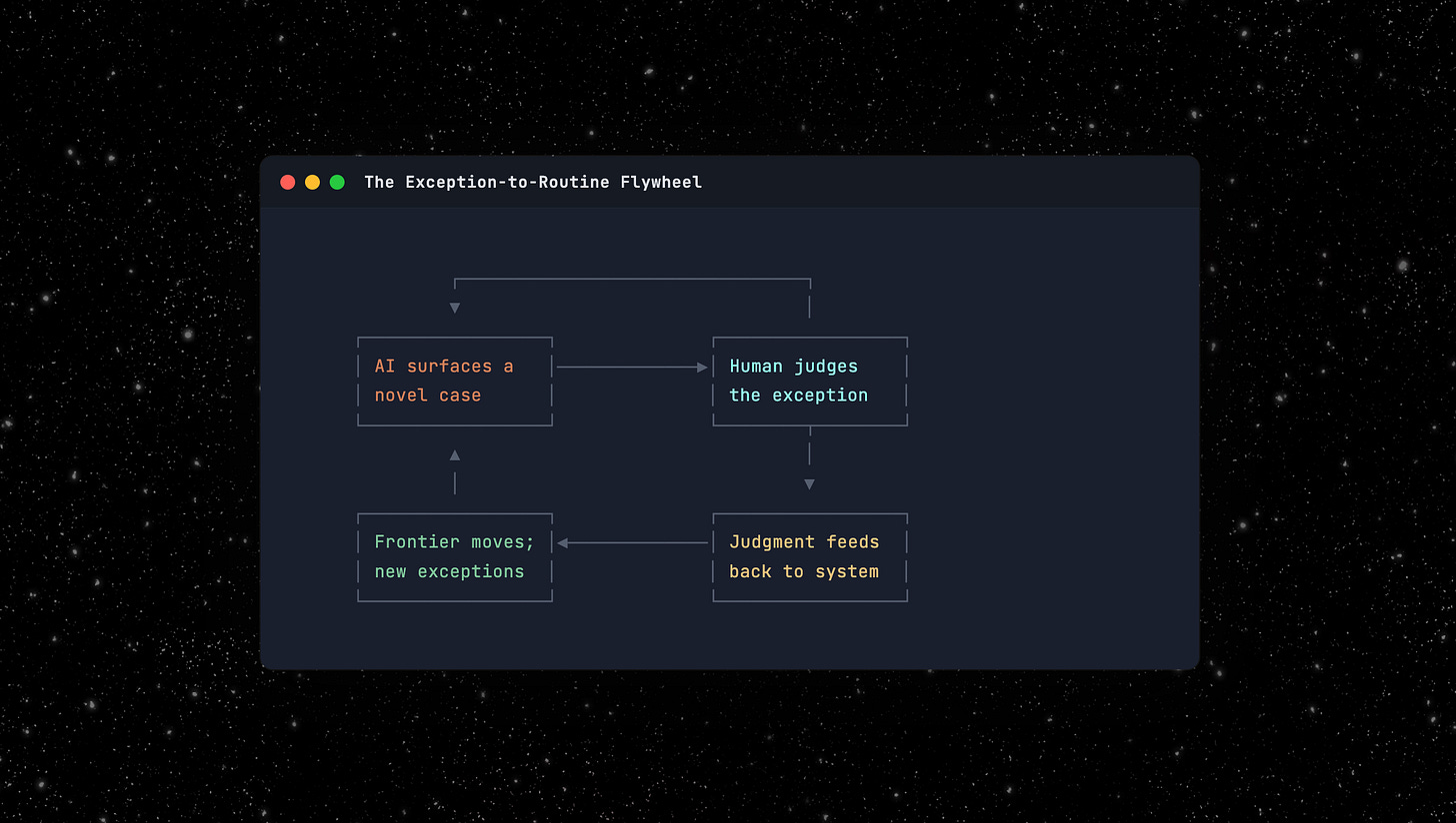 But the exception pool doesn’t shrink to zero. The frontier moves. Automate today’s exceptions and you can take on risk classes you couldn’t touch before. That generates new exceptions at a higher level of complexity. The human doesn’t become unnecessary. The human operates on increasingly valuable problems.