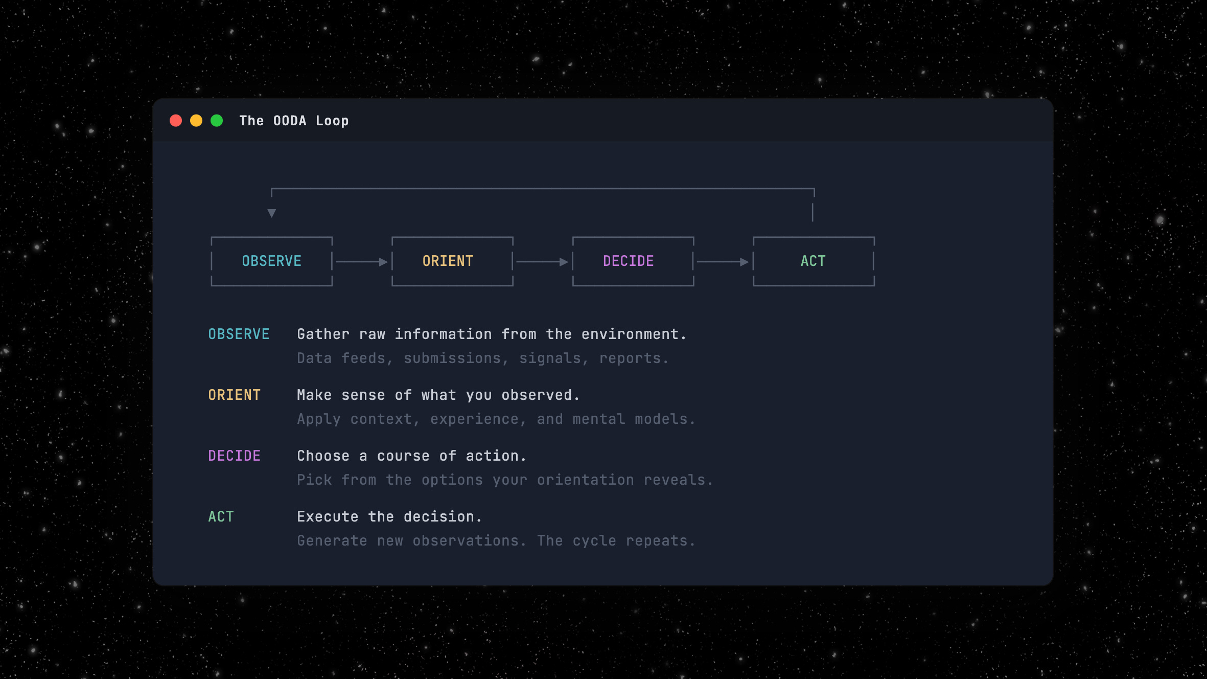 In the 1970s, an Air Force Colonel named John Boyd formalized what that 150-pound computer does. He called it the OODA loop: Observe, Orient, Decide, Act. A decision cycle built for fighter pilots. Cycle faster than your opponent and you win. It proved far more universal than Boyd intended.1