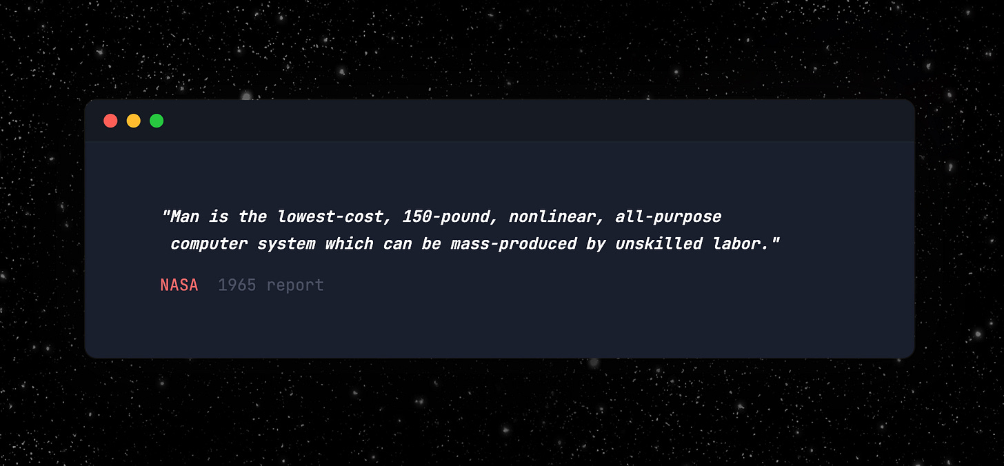 For decades, this was the operating assumption. Humans were the cheapest general-purpose computers available. Hire them, give them tools, let them process information and make decisions.