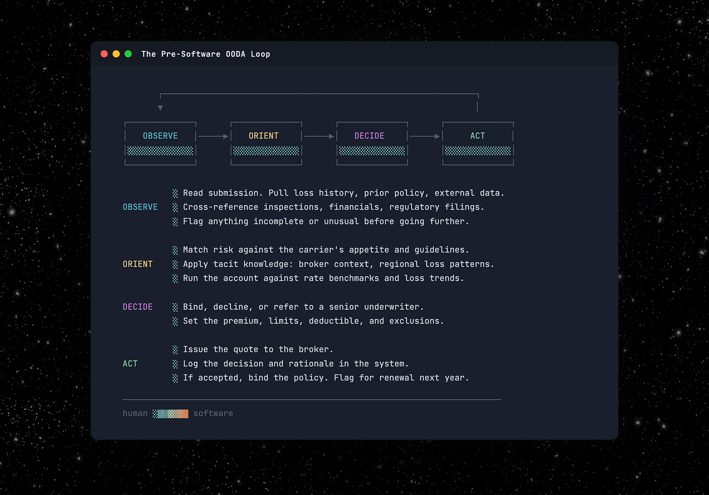 The OODA loop is everywhere. But let’s take insurance underwriting as an example. Submissions land on an underwriter’s desk. She reads the submission, matches it against her carrier’s appetite, decides whether to bind or decline, and issues the quote. Observe, Orient, Decide, Act. Dozens of times a week.