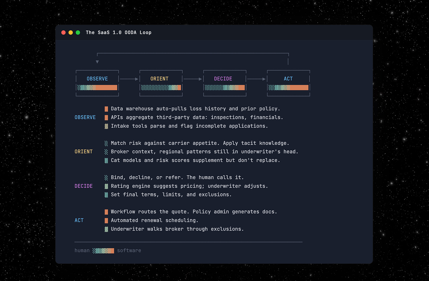 Software made parts of that loop faster, particularly Observe and Act. Data warehouses and submission intake tools on the Observe side. Policy admin systems and workflow automation on the Act side. Rating engines and risk scores nibbled at Orient and Decide, but the core of both (judgment, context, the actual call) stayed human. You can only cycle as fast as the slowest step allows.