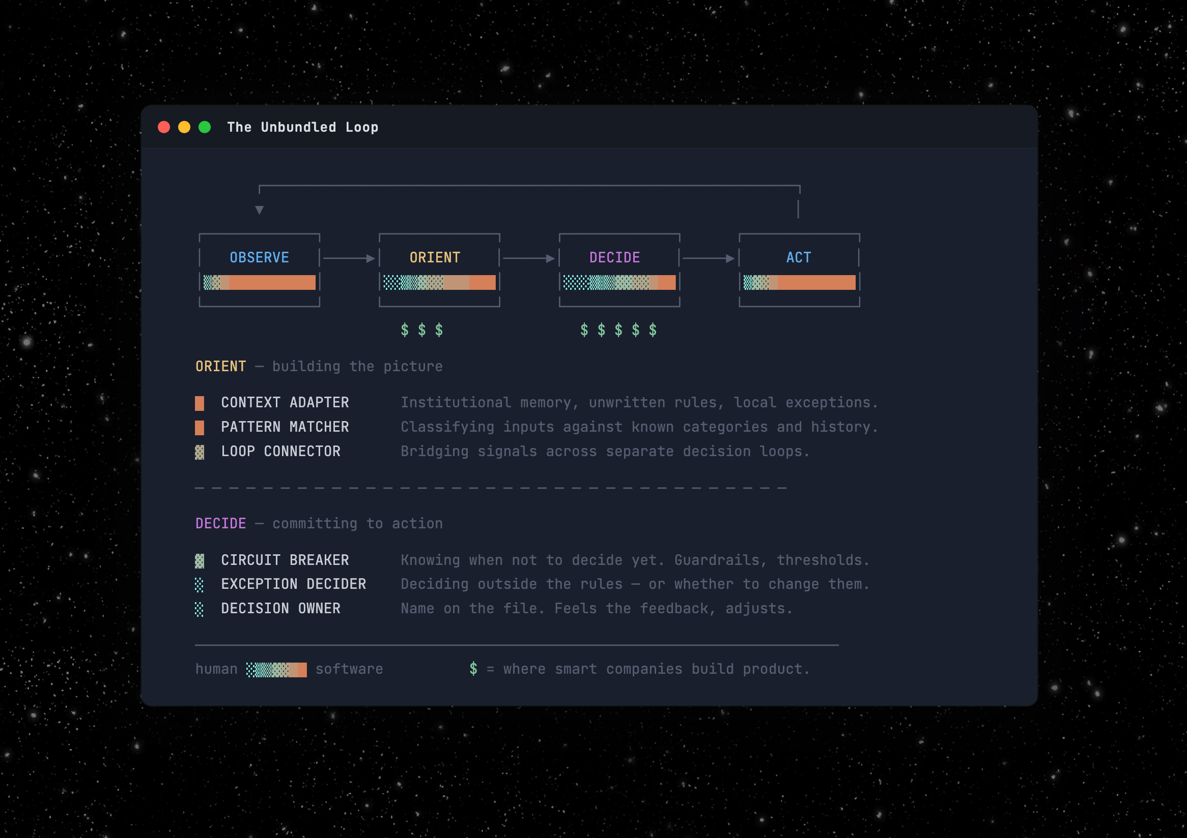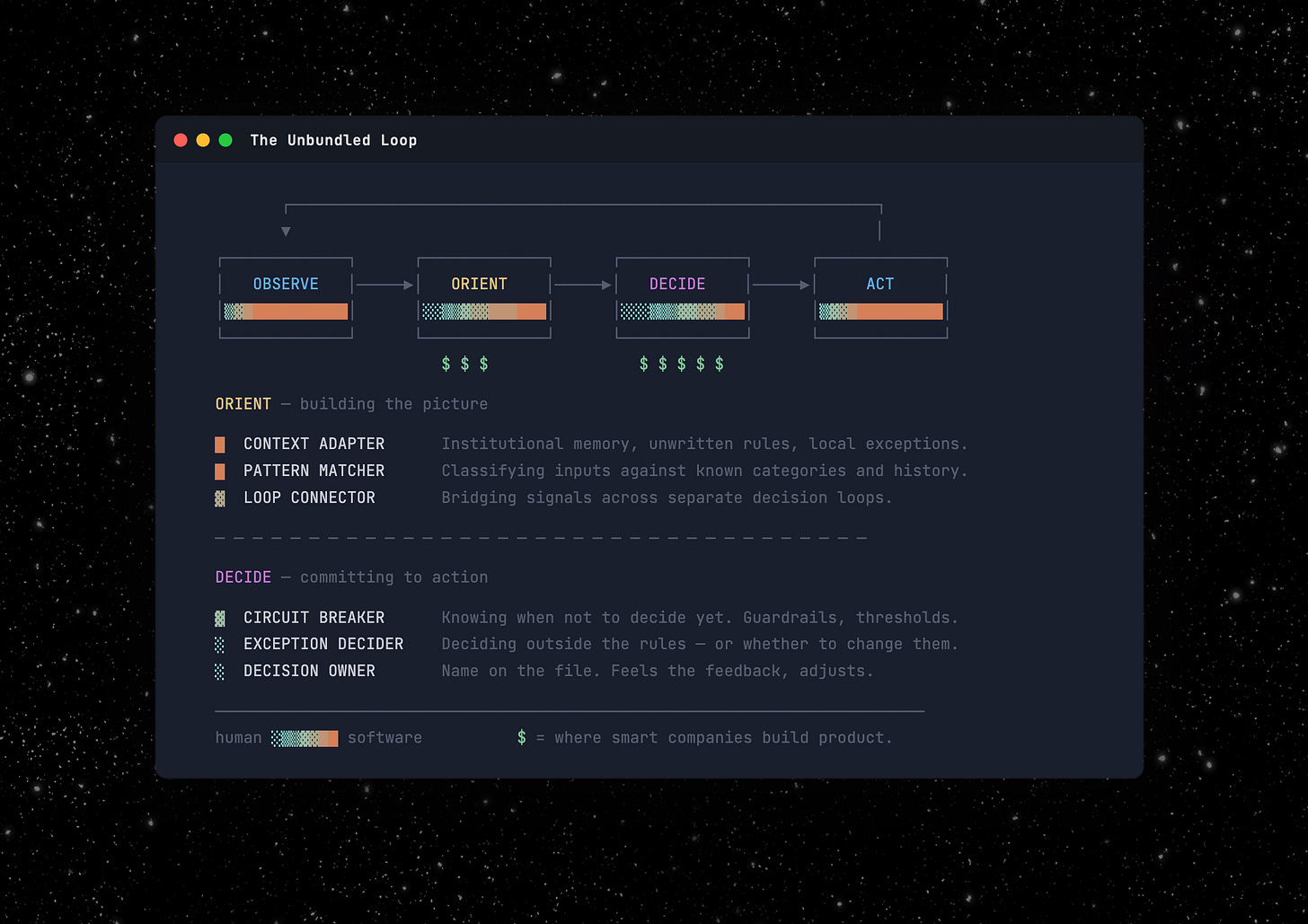 Every job is an OODA loop. AI doesn't replace the loop, but unbundles it into sub-functions. The most valuable ones are irreducibly human, and the smart companies are building for that.