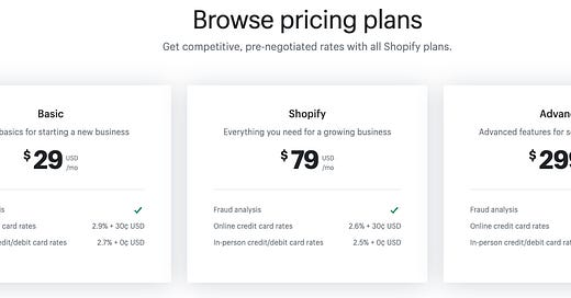 If you’re also charging a SaaS fee, you’ll want to consider whether different SaaS plans will have different payment processing rates. This often comes up later in the lifecycle of a payments program, as you have enough volume to negotiate better pricing with your processor and you have a better idea of the payment volume, risk profiles, and resulting economics of various user buckets. As an example, Shopify lowers its payment processing rates with each higher priced SaaS plan: